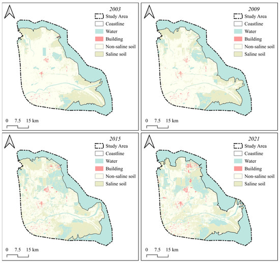 According to the results of the soil salinization inversion model selection, it can be seen that the Support Vector Machine model inversion effect is accurate, and it is the optimal soil salinization inversion model, so we chose this model for soil salinization inversion prediction. Meanwhile, since this study mainly explores the land salinization problem in the Yangtze River Delta region, and the study area is adjacent to the Bohai Sea, with well-developed seafood agricultural cultivation and fishery farming and a large network of water bodies in the region, the spectral information of the water bodies can easily have an impact on this study, and the binary classification machine learning model can easily classify the water bodies as saline or non-saline soils. Therefore, before quantitative statistical analysis weas performed on the final inversion results, the area of water bodies in the region was extracted by calculating the NDWI and utilizing the single-band threshold method, and the area of buildings in the region was extracted by visual interpretation to eliminate the influence of the area of water bodies and buildings on the final results, and to ensure the accuracy of the subsequent statistics. The final inversion results for each year are shown in Figure 3.
