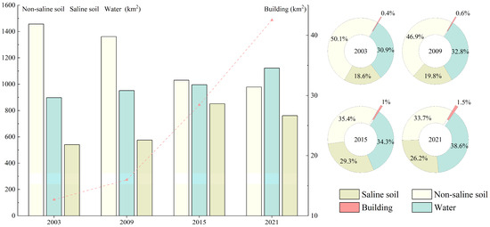 The area of non-salted soil in the YRD has been decreasing year by year (Figure 4), while the area of buildings and water bodies has been increasing. The area of salted soil has shown a trend of first increasing and then decreasing. Between 2003 and 2009, the area of salted soil increased from 538.5 km2 to 575.3 km2, a relatively small increase. The largest increase occurred from 2009 to 2015, with a 47.95% rise from 575.3 km2 to 851.3 km2. From 2015 to 2021, the area of salted soil decreased from 851.3 km2 to 761.4 km2. Overall, the area of salinized soil increased from 538.4 km2 in 2003 to 761.5 km2 in 2021, with its proportion of the total study area rising from 18.6% in 2003 to 26.2% in 2021. The area of water bodies increased from 897.9 km2 in 2003 to 1122.3 km2 in 2021, indicating an expansion of the water network in the region. The built-up area also increased from 18.2 km2 in 2003 to 42.5 km2 in 2021.