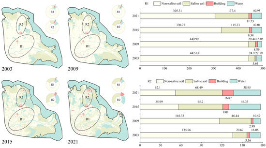 - Soil salinization in the YRD gradually decreases spatially from the coast to the inland, with serious salinization in the northern and eastern regions. In terms of area, it shows a trend of increasing and then decreasing, with the saline soil area increasing from 538.4 km2 to 761.5 km2 between 2003 and 2021, and the saline soil transformations in some areas are also different, with R2 mainly transforming from arable land and R1 distributed around newly built buildings. Soil salinization has become more common and serious, which is also consistent with the actual situation.