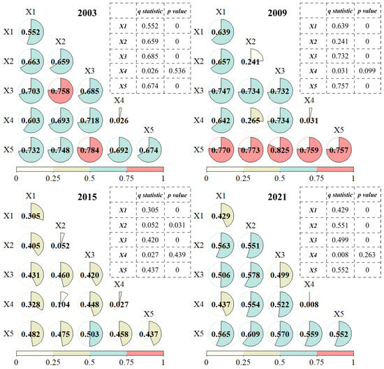 Among the factor detections in the four historical stages, the distance to the Bohai Sea (X1), quarterly average potential evapotranspiration (X3), and quarterly average normalized vegetation index (X5) were at a high level. The annual cumulative precipitation (X2), as an inter-annual climate change quantity, and due to the fact that coastal areas are usually characterized by a dry climate with high inter-annual variability of precipitation, it also varies greatly in the factor detection results at various historical stages, but most of them show a strong correlation. In contrast, population density (X4), as an indirect indicator of human activities, was less well represented in the factor detection results. In the interaction detection results, the interaction effects of each driver were stronger than the single-factor effects.
