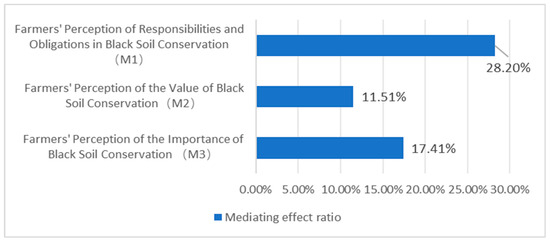 Figure 2 shows the proportion of farmers’ cognitive mediation effect. In terms of the proportion of mediation effects, the order from largest to smallest is: farmers’ cognition of responsibilities and obligations (28.20%) > farmers’ cognition of importance (17.41%) > farmers’ value recognition (11.51%). This suggests that among the factors influencing participation in actual black soil conservation behaviors, farmers’ cognition of responsibilities and obligations has the strongest mediating effect. The “Law on Black Soil Protection of the People’s Republic of China” clarifies the responsibilities and obligations of participants in black soil conservation, and related protective policies primarily direct farmers to enhance their awareness of these responsibilities, yielding noticeable effects. Overall, farmers’ cognition of responsibilities and obligations, value recognition, and importance all play mediating roles in influencing their black soil conservation behaviors, with notable differences in the mediation effects.