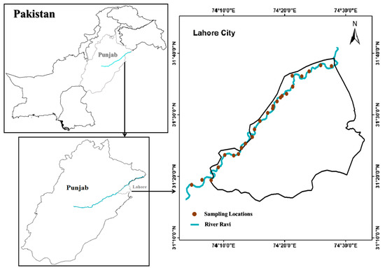 Furthermore, combining chemical, toxicological, and ecological data allows for a comprehensive evaluation of the impact of PTMs pollution, as reported in studies conducted on sediments of various aquatic ecosystems of the world, including the River Ravi in Pakistan and the Beas River in India [10], the Bahmanshir River, Iran [11], Lake Qarun [12], the Nile River, Egypt [13], Kaptai Lake, Bangladesh [14], Caohai Wetland [15], Xiaoqing River Basin, China [16], estuarine sediments of the Southeastern Black Sea, Turkey [17], and the northern Amazon region of Ecuador [18]. However, several other studies reported elevated PTM pollution in rivers and lakes of Pakistan, accounting for the River Indus [19,20,21], Kabul, Sutlej, Ravi, Jhelum, and Chenab rivers [3], Uchalli lake Ramsar site [4], Keenjhar Lake [22], and others [23,24,25]. Nevertheless, the information on the River Ravi regarding PTM pollution status is lacking, despite the continuous anthropogenic input with the rapid increase in urbanization.