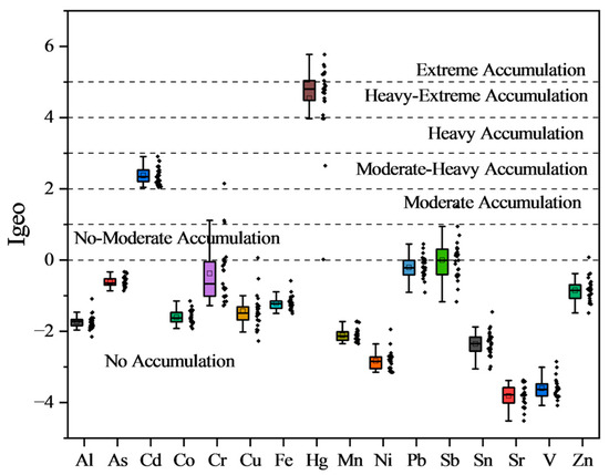 Calculated mean Igeo values of PTMs are in the order of Hg> Cd > Sb > Pb > Cr > As > Zn > Fe > Cu > Co > Al > Mn > Sn > Ni > V > Sr (Figure 2). The geo-accumulation indices were calculated based on the shale values reported for the upper continental crust. According to Müller’s classification of Igeo values, no accumulation class was observed for Al, As, Cd, Co, Cr, Cu, Fe, Hg, Mn, Ni, Pb, Sb, Sn, Sr, V, and Zn for having Igeo < 0. However, moderate-to-heavy accumulation (2 < Igeo ≤ 3) existed for Cd, having an Igeo value of 2.37, and heavy-to-extreme accumulation (4 < Igeo ≤ 5) was estimated for Hg with an Igeo value of 4.54.