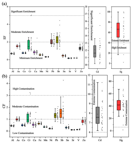 According to the EF calculations (Figure 3a), minimum enrichment was found for Al, As, Co, Cu, Fe, Mn, Ni, Sn, Sr, V, and Zn, having EF values in the range of 0 < EF ≤ 2. However, moderate enrichment (2 < EF ≤ 5) was observed for Cr, Pb, and Sb, having EF values of 2.27, 2.04, and 2.52, respectively; significant enrichment (5 < EF ≤ 20) was the case with Cd, with the EF value of 12.10, and extreme enrichment (EF > 40) was posed for Hg, having an EF value of 63.20.