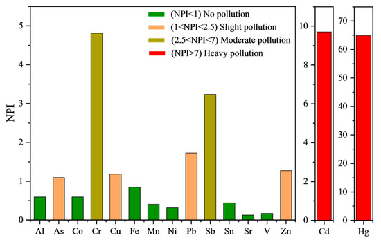 The NPI results revealed that in river sediments, no pollution was observed for Al, Co, Fe, Mn, Ni, Sn, Sr, and V (NPI < 1). However, slight pollution (1 < NPI < 2.5) was observed due to As, Cu, Pb, and Zn, while moderate pollution (2.5 < NPI < 7) was reported for Cr (4.81) and Sb (3.23). Heavy pollution (NPI > 7) in the sediments was revealed, due to elevated levels of Hg (64.9) and Cd (9.70) (Figure 4). These results underscore the urgent need for swift and comprehensive environmental action.