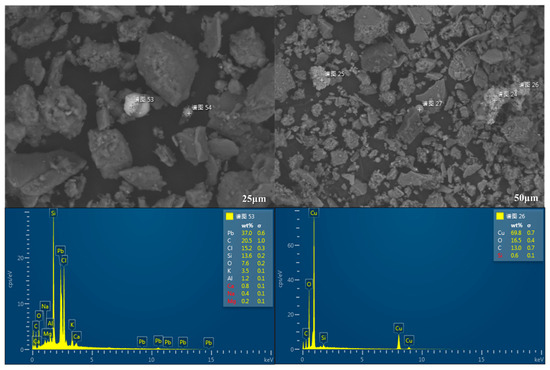 The SEM images were taken at various magnifications to study morphology and anthropogenic influence on the sediments, and results are depicted in Figure 7 and Figure S4. The observations under SEM lenses depicted those sediments carrying several shapes of particles, with varying particle sizes. However, the EDS spectra showed that relatively smaller particles were carrying silicon and aluminum elements, indicating that the association with aluminosilicates comes from the weathering process of minerals and rocks. Overall, sediments predominantly contain elements like Si, Mg, Al, Ca, Ti, and V, which can be associated with those naturally concentrated in the Earth’s crust [53,54], while the anthropogenic particles can be distinguished and spotted in Figure 7 and Figure S4, predominantly carrying PTMs like Cu, Fe, Pb, and Zn. Clearly, anthropogenic input was evident in distinguished particles in sediments. Local characteristics of the sampling area were observed for anthropogenic influence on the River Ravi. Predominantly, roadside activities, plastic factories, agricultural farmland areas, boating, picnic points, and ceramic processing units were observed widely, and were perhaps the source of anthropogenic influence. However, these anthropogenic activities can be associated with potential sources of PTMs in the sediments [55,56].