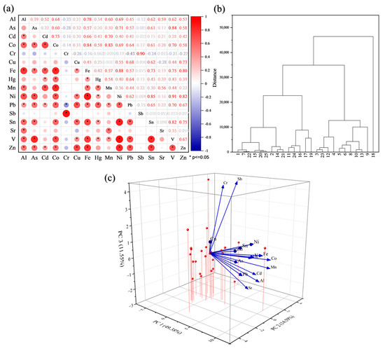 Results of multivariate statistical analysis illustrating the (a) corrplot of Pearson’s correlation coefficient (PCC) at p < 0.05; (b) cluster analysis (CA) dendrogram; and (c) principal component analysis (PCA) using the rotation method (varimax with Kaiser normalization).