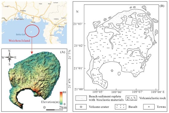 Formed by volcanic eruptions and subsequent deposits, Weizhou Island is covered with weathered purple-red basalt. Its topography is relatively simple, with the southern region predominantly marked by sea-eroded landforms, while the northern half features marine sediment landforms [40]. During the early to middle Pleistocene, the Henglu Mountain volcano in the northwest underwent prolonged eruptions, producing lava flows that formed the basalt. In the late Pleistocene, volcanic eruptions and an injection of gas into the southern Nanwan region led to significant volcaniclastic deposition. These are the predominant lithological types on the island [41,42]. Additionally, the northeastern coastal area is rich in beach sediments composed of bioclastic materials, including layered beach rocks, quartz sandstone, and coral gravel. These rocks are primarily composed of quartz sand and bioclastic material [43,44]. The geological map of the study area is shown in Figure 1.