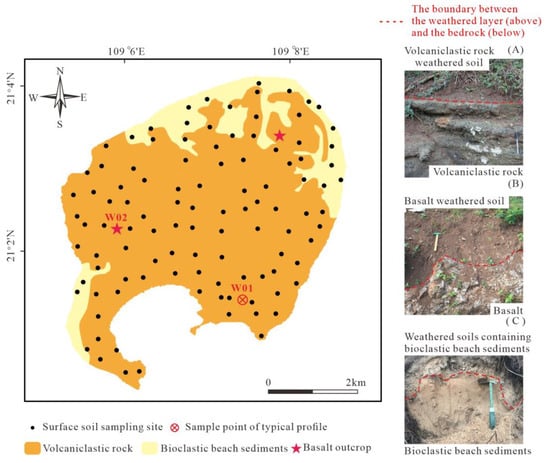 The sampling sites are shown in Figure 2. Surface soil sampling was conducted across the entire Weizhou Island. A total of 103 surface soil samples (0–20 cm depth) were collected using a grid method (500 m × 500 m), along with 16 fresh rock samples taken from the same locations as the soil samples. These comprised 10 volcaniclastic rocks, 3 basalt rocks, and 3 beach sediments containing bioclastic materials. Profiles W01 and W02 were specifically selected for additional sampling to examine vertical weathering patterns and provide a more comprehensive understanding of the soil-formation processes at different depths. The weathering crust in profile W01, located in Wucaitan, is characterized by volcaniclastic rock lithology, which is representative of a key geological feature of the island. In contrast, profile W02 represents a basalt weathering crust, offering a distinct comparison with W01. These profiles were chosen because they represent the two main lithological types found on the island, and sampling at these locations allows for a deeper understanding of weathering processes and the vertical distribution of heavy metals.