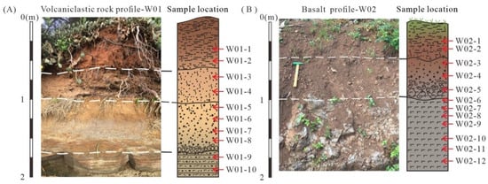 Comparative profiles of two lithologic parent rocks in the study area: (A) sampling profile of the W01 volcaniclastic rock; (B) sampling profile of the W02 basalt.