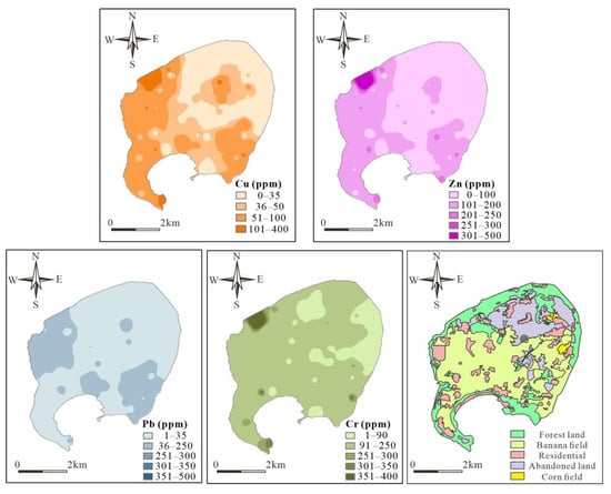 The distribution of heavy metal concentrations in the soil system is influenced by inputs from the underlying soil parent material and human activities, including the redistribution of heavy metals in response to changes in land use [60,61]. Different land use types exert varying effects on soil heavy metal concentrations. According to the land use type map, Cu concentrations in the study area follow the following sequence: abandoned land > banana field > forest land > corn land. This distribution is attributed to higher Cu concentrations in desert areas and lower Cu concentrations in forests, influenced by human activities. Additionally, the elemental composition of the soil parent material influences soil heavy metal concentrations. The higher Cr concentrations in forest land are linked to elevated concentrations in the soil parent material in these regions.