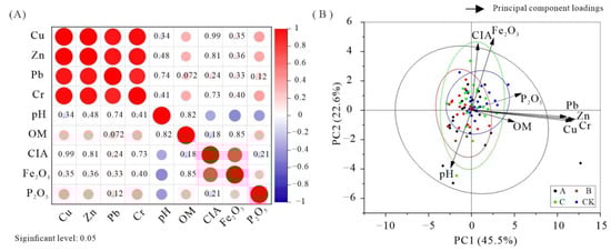 (A) Pearson correlation analysis of Cu, Zn, Pb, Cr, pH, OM, Fe2O3, and P2O5 in surface soils of Weizhou Island; (B) principal component analysis of heavy metal content, pH, OM, CIA, Fe2O3, and P2O5 in surface soil.
