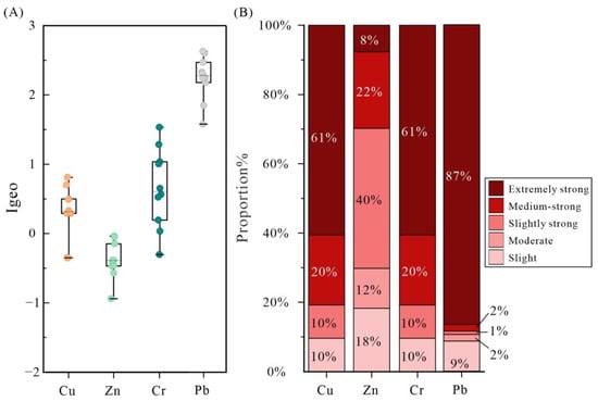 (A) Box plot of Cu, Zn, Pb, and Cr accumulation indices in soil pollution; (B) statistical analysis of the potential ecological risk index of soil pollution.