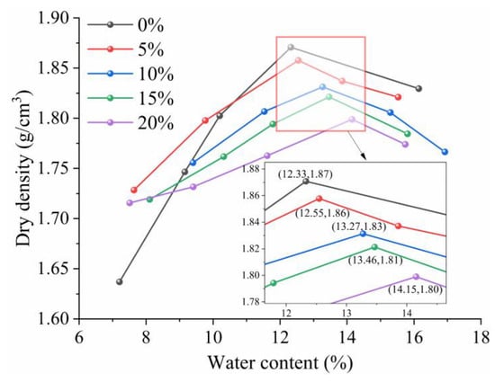 The collected soil samples were subjected to crushing, drying, and sieving treatments. After drying, the moisture content of the soil samples was determined to be 1.58%. The fly ash was added in proportions of 0%, 5%, 10%, 15%, and 20%, resulting in five different mixtures. For each mixture, five different moisture contents—9%, 11%, 13%, 15%, and 17%—were tested by adding water to achieve the corresponding moisture levels. Compaction tests were conducted using the JDS-2 lightweight compaction apparatus, produced by Nanjing Soil Instrument Co., Ltd. According to the method specified in the Chinese standard “Soil Testing Method Standards” (GB/T 50123-2019), the soil was added in three layers, with each layer compacted using a 2.5 kg hammer falling freely from a height of 305 mm. Each layer of soil was compacted with 25 blows. The moisture content and density of the compacted soil were then measured, and the maximum dry density and optimum moisture content of the soil samples with different fly ash proportions were determined.