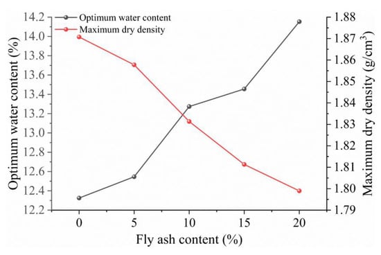 The obtained optimum moisture content and maximum dry density were plotted as a relationship curve (Figure 8) to explore the correlation between the three factors. From the figure, it can be observed that as the fly ash content increases, the optimum moisture content shows an increasing trend, while the maximum dry density of the soil samples exhibits a decreasing trend.