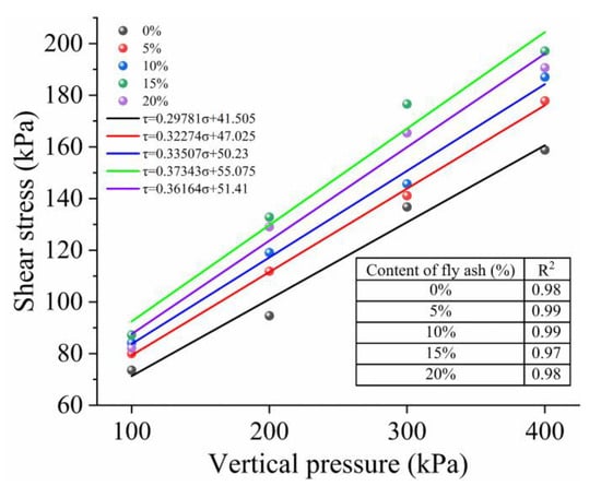 Through linear fitting, the relationship curves between shear strength and vertical pressure for different fly ash proportions are presented in Figure 10. The R2 values are close to 1, indicating a good fit.