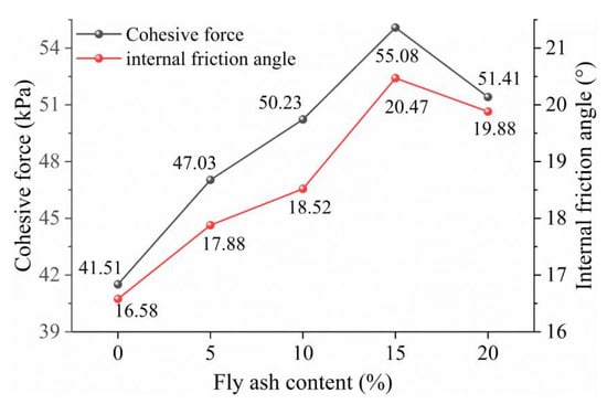 The relationship curves between cohesion, internal friction angle, and fly ash content.