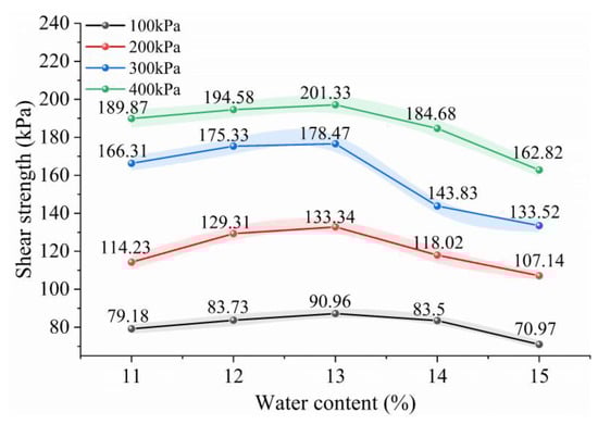 After the experimental data were processed, Figure 12 was generated to illustrate the shear strength curves of soil samples at different water contents under various vertical pressures. When the vertical pressure is 100 kPa, the shear strengths of soil samples with moisture contents of 11%, 12%, 14%, and 15% are reduced by 11.78 kPa, 7.23 kPa, 7.46 kPa, and 19.99 kPa, respectively, compared to the soil sample with a moisture content of 13%. When the vertical pressure is 200 kPa, the shear strengths of soil samples with moisture contents of 11%, 12%, 14%, and 15% are reduced by 19.11 kPa, 4.03 kPa, 15.32 kPa, and 26.2 kPa, respectively, compared to the soil sample with a moisture content of 13%. When the vertical pressure is 300 kPa, the shear strengths of soil samples with moisture contents of 11%, 12%, 14%, and 15% are reduced by 12.16 kPa, 3.14 kPa, 34.64 kPa, and 44.95 kPa, respectively, compared to the soil sample with a moisture content of 13%. When the vertical pressure is 400 kPa, the shear strengths of soil samples with moisture contents of 11%, 12%, 14%, and 15% are reduced by 11.46 kPa, 6.75 kPa, 16.65 kPa, and 38.51 kPa, respectively, compared to the soil sample with a moisture content of 13%. Under different vertical pressures, the shear strength of the soil initially increases and then decreases with increasing moisture content. The overall shear strength of the soil is maximized when the moisture content is 13%.