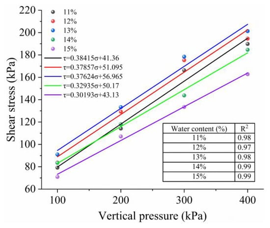 The same method was applied, and the relationship curves between shear strength and vertical pressure for different water contents were obtained through linear fitting, as shown in Figure 13. The R2 values were all close to 1, indicating a good fit.
