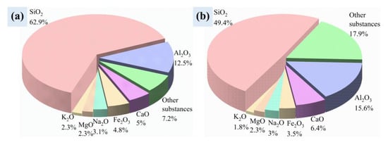 The content of the major chemical components and heavy metals in the fly ash was analyzed, and the processed data are presented in Table 2 and Table 3. The content of SiO2 and Al2O3 in the fly ash is relatively high, accounting for 51.2% and 28.9%, respectively, while the content of other substances is comparatively lower. Specifically, Fe2O3 accounts for 7.3%, CaO for 4.7%, K2O for 2.7%, TiO2 for 2.1%, SO3 for 1.1%, Na2O for 0.6%, MgO for 0.5%, and P2O5 for 0.5%. The content of heavy metals in the fly ash, including cadmium, mercury, arsenic, copper, lead, chromium, nickel, and zinc, are 168.18, 67.06, 14,481.04, 19,680.21, 15,619.51, 52,290.80, 25,689.10, and 63,024.80 µg/kg, respectively. All measured values are below the pollution standards specified in the relevant regulations.