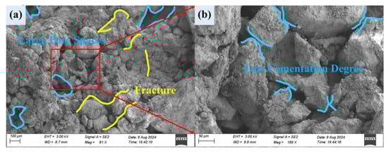 The microstructural changes in the gravel layer soil before and after fly ash modification were investigated using scanning electron microscopy (SEM). Both untreated soil samples and soil samples with 15% fly ash content were examined under SEM. The microstructure of the untreated soil sample is shown in Figure 17. At 500× magnification, the surface of the soil exhibits a rough and uneven texture, with a relatively loose skeleton and numerous large, irregular pores. At 1000× magnification, the bonding between particles is weak, and the soil exhibits poor compaction.