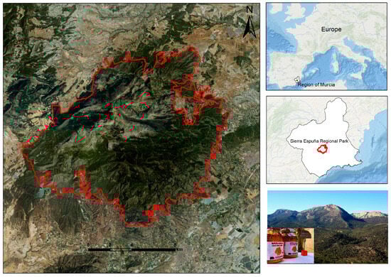 To exemplify the social valuation of territorial brands in protected natural spaces, the Sierra Espuña Regional Park in the Region of Murcia (southeastern Spain) was selected for analysis (Figure 1). The protected area, located in the territory of three municipalities, covers approximately 18,000 hectares and allows for public use in a way that is compatible with the protection strategies in place, making it one of the largest representatives of the Mediterranean forest of the Iberian southeast [55]. The combination of public use and protection strategies has led to a reduction in the provision of more intensive provisioning ecosystem services, such as timber extraction, and the provision of other more sustainable provisioning services such as food supply. In addition, together with the conservation of the regulation and support services of the protected natural space itself (e.g., climate regulation, flood control, erosion control, pollination, biodiversity, etc.), the provision of more cultural ecosystem services has been promoted in recent years to encourage recreation in this area and provide an economic incentive for local economies.