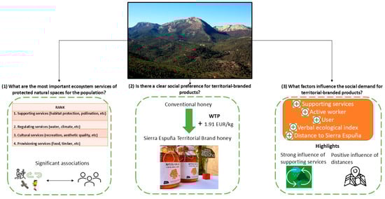 This study addresses the social demand for one of the rural development strategies in protected natural spaces that has been studied little in the literature from a socio-economic perspective: territorial-branded products. To address the gap in the literature, this study employs the example of honey as a territorial brand within the context of one of the most well-known protected natural areas in southeastern Spain, namely, the Sierra Espuña Regional Park. By utilising a combination of surveys incorporating social participation techniques and a contingent valuation method, this study was able to respond to the three research questions that were initially formulated (Figure 2):