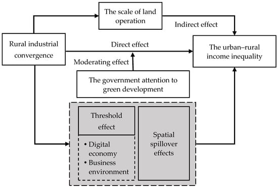 In many countries, the urban–rural income inequality affects healthy and sustainable economic development and is a pressing issue that requires immediate attention. As a new industrial development model, rural industrial convergence can provide new ideas and impetus for alleviating the urban–rural income inequality. This study, drawing on provincial panel data from China spanning 2010 to 2022, used the entropy method and Theil index to measure the rural industrial convergence and the urban–rural income inequality, respectively, and empirically tested the effect and mechanism of rural industrial convergence on the urban–rural income inequality. The results showed the following: (1) Rural industrial convergence had a notable impact on alleviating the urban–rural income inequality. (2) Rural industrial convergence could help reduce the urban–rural income inequality by increasing the scale of land operation. (3) The government attention to green development could positively moderate the impact of rural industrial convergence on the urban–rural income inequality; the deeper the government attention to green development, the greater the role rural industrial convergence played in alleviating the urban–rural income inequality. (4) There was a threshold effect in the alleviating effect of rural industrial convergence on the urban–rural income inequality, which was gradually strengthened when the growth of the digital economy and the enhancement of the business environment were beyond the threshold point. (5) Rural industrial convergence also had significant spatial spillover effects on adjacent regions. Overall, the findings of this study enrich the research on the impact of rural industrial convergence on the urban–rural income inequality and provide insights for other similar countries.