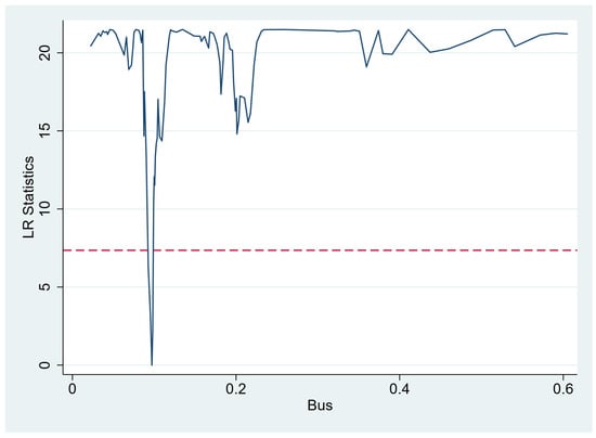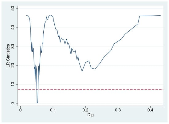 Figure 3 shows the LR diagram with the digital economy as the threshold variable, and Figure 4 shows the LR diagram with the business environment as the threshold variable. The lowest point of the LR statistic corresponds to the true threshold value, and the dotted line below refers to the threshold interval corresponding to the critical value under the significance level of LR less than 5%.