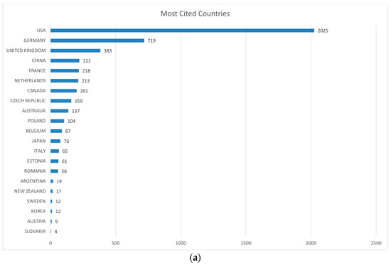 The United States, with 145 articles and over 2000 cited documents, has a robust research infrastructure and significant interest in urban ecology and green space initiatives (Figure 4 and Figure 5). The high frequency suggested extensive U.S. investment in exploring the myriad benefits of IGSs, from ecological services to community well-being.