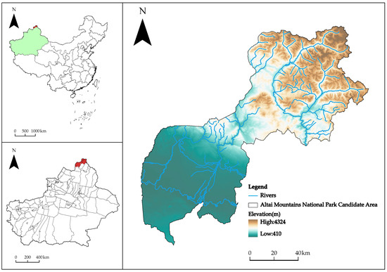 The Altai Mountains National Park Candidate Area (Figure 2) is located in the central Altai Mountains, within the Altay region of Xinjiang, China, covering a total area of 13,386 km2. This region is notable for its rich biodiversity, functioning as China’s only continental tundra zone and the sole representative of Siberian biota within the nation. This unique status underscores its ecological significance, as it supports distinct flora and fauna that are not found elsewhere in China, contributing to the overall biodiversity and ecological resilience of the region. It serves as a crucial refuge for several rare and endangered species, including the Snow Leopard (Uncia uncia), Sable (Martes zibellina), Pallas Cat (Otocolobus manul), Eurasian Lynx (Lynx lynx), Black Stork (Ciconia nigra), and Capercaillie (Tetrao urogallus) [46]. Additionally, the area provides significant habitats for the Siberian taiga, Siberian pine, and larch. Forest and grassland ecosystems in this region are recognized as key biodiversity hotspots in the Xinjiang Altay area, delivering essential ecosystem services that sustain endemic flora and fauna.