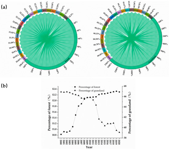 (a) Annual distribution of forest and grassland percentages in the Altai Mountains National Park Candidate Area from 2000 to 2020. (b) Trends in forest and grassland percentages over time.