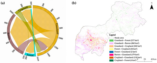 Forest and grassland ecosystem transfer chord diagram in the Altai Mountains National Park Candidate Area from 2000 to 2020 (a) and its spatial transfer distribution (b).