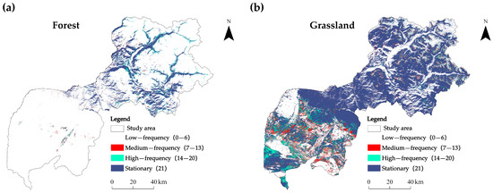 The spatial distribution of forest and grassland in the Altai Mountains National Park Candidate Area was analyzed at the pixel level for the period from 2000 to 2020. The frequency of forest and grassland occurrence within each pixel during this 21-year period was calculated and classified into four categories: low-frequency presence (0–6 years), medium-frequency presence (7–13 years), high-frequency presence (14–20 years), and stable presence (21 years).