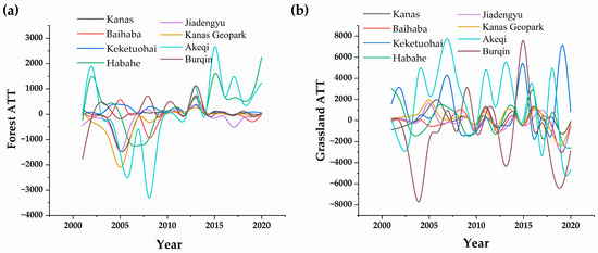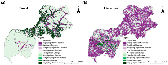 Spatial distribution of ecosystem change trends in the Altai Mountains National Park Candidate Area from 2000 to 2020: (a) forest ecosystem and (b) grassland ecosystem.