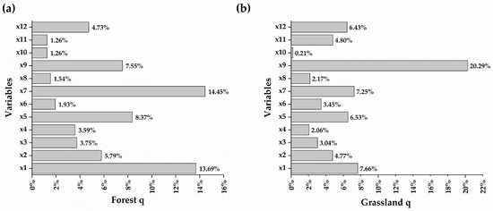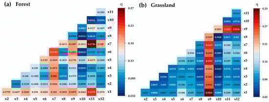 The single-factor detection results of ecosystem changes in the Altai Mountains National Park Candidate Area: (a) forest ecosystem and (b) grassland ecosystem. (×1: elevation, ×2: slope, ×3: average annual temperature trends, ×4: average annual precipitation trends, ×5: SPEI trends, ×6: GPP trends, ×7: soil type, ×8: grazing intensity trends, ×9: cropland trends, ×10: population distribution trends, ×11: distribution of tourist attractions, ×12: distribution of mining sites).