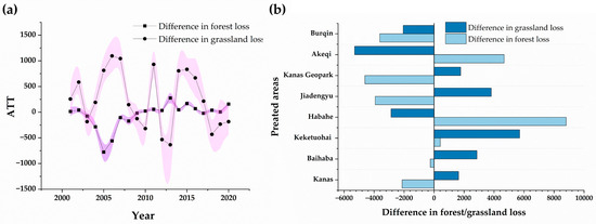 Conservation efforts in existing protected areas have primarily focused on forests, often neglecting grasslands. Figure 9a illustrates the difference in forest and grassland loss between protected and unprotected areas from 2000 to 2020. This indicates that the protected areas significantly reduced forest loss in 2005 and grassland loss in 2012–2013, but were generally less effective in limiting grassland loss. The differences in forest and grassland loss across different protected areas (Figure 10) reflect the variation in the impact of management initiatives. Kanas, Baihaba, Jiadengyu, and Kanas GeoPark exhibit similar tendencies in preventing the loss of both forests and grasslands. However, Baihaba exhibited distinct manifestations in 2005, effectively curbing grassland loss but being less efficacious in reducing forest loss. Keketuohai was less efficient in curbing the loss of both forests and grasslands. Habahe and Akeqi performed optimally in forest protection in 2006 and 2007, and 2005 and 2008, respectively. Burqin effectively mitigated grassland loss in 2004, 2013, and 2019. The effectiveness of different protected areas in reducing forest and grassland loss varies over time, potentially due to differences in their management strategies and environmental characteristics. Furthermore, all protected areas exhibit fluctuating disparities in the loss of forests and grasslands, highlighting the necessity of continuous and adaptive management to guarantee the success of long-term conservation.