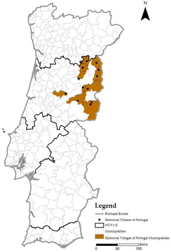 The network of Historic Villages of Portugal (HVP) has a complex territorial framework, mainly developed in low-density areas, comprising 12 places, villages, and towns with multiple ecocultural resources (cultural, natural, and landscape), spread over 10 municipalities in the interior of the Central Region of Portugal (NUT II), mostly close to the border with Spain (Figure 1, Table 1).