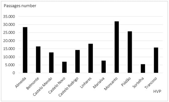 On the other hand, if we look at the periods of least traffic verified by the automatic counters, we can see that on most of the lines, the least traffic occurs in winter (especially in January and December), in the cases of Almeida, Castelo Rodrigo, Linhares, Monsanto, Piódão Sortelha, and Trancoso. On the other hand, on four of the routes, the lowest frequencies occur in summer (July and August), in the case of Belmonte, Castelo Mendo, Castelo Novo, and Marialva.