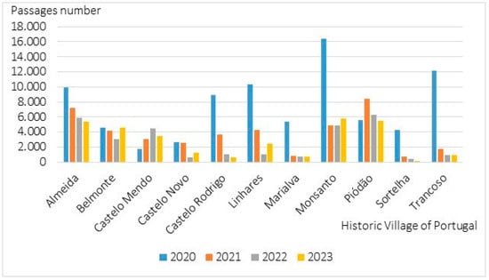 On the other hand, in 2023, five trails of the network recorded the lowest number of passages in the series (Almeida, Castelo Rodrigo, Piódão, Sortelha, and Trancoso), followed by 2022, when four trails recorded the minimum number of passages (Belmonte, Castelo Novo, Linhares, and Marialva). Finally, in 2020, Castelo Novo, unlike the others, recorded the minimum number of passages.