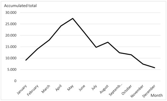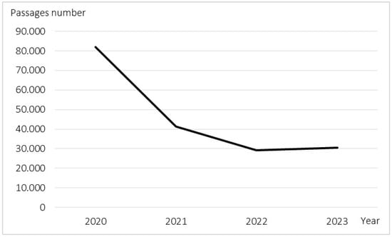 In the dataset analysed, 2020 was the year with the highest number of passages on the trails, with 81,890 passages, followed by a sharp decline in 2021 (−49.4%) to 41,437 passages, with a further decline between 2021 and 2022, although less marked (−29.8%), to 29,101 passages. In 2023, there was a slight recovery compared to 2022, with 30,417 passages (+4.3%) (Figure 4).