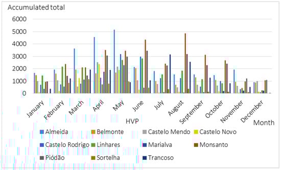 Looking at the average variation in demand over the months of the year, it can be seen that the trails located in the HVP of Belmonte (AD = 2.27%), Piódão (AD = 2.98%), and Monsanto (AD = 3.17%) have less variation in average monthly demand. On the other hand, the HVPs of Castelo Novo (AD = 9.18%), Marialva (AD = 7.23%), and Sortelha (AD = 6.6%) show a much more uneven distribution of demand over the months of the year.