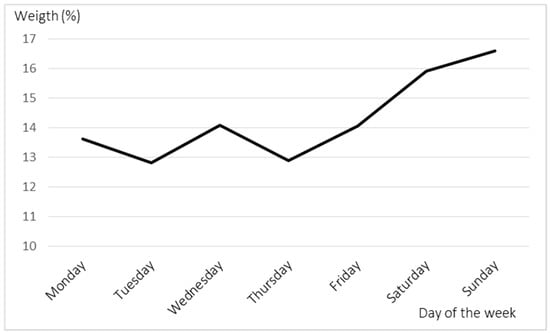 The analysis of demand by day of the week shows a greater concentration of passages during the weekend, corresponding to 32.5% of the total number of passages recorded. The day of the week with the lowest frequency is Tuesday, with 12.8% of the total number of passages recorded (Figure 7).