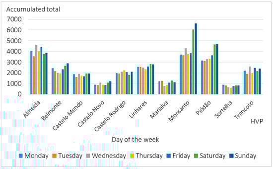 Looking at the day of the week with the lowest number of registered passages, Tuesday is the day with the most trails (Almeida, Castelo Mendo, Monsanto, Piódão, and Trancoso). This is followed by Thursday (Belmonte, Linhares, and Sortelha), Wednesday (Marialva), Friday (Castelo Novo), and Saturday (Castelo Rodrigo).