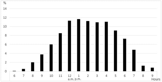 On the other hand, in summer, the average number of passages during the hours of maximum sunshine (from 12 to 4 p.m.), which reflects the time window with the highest average demand recorded by the counters, varies between 53.54% (August) and 46.48% (July), below the annual average. In the case of winter, this time window (from 12 to 4 p.m.) represents average counts above the annual reference percentage, varying between 71.81% (December) and 66.12% (January), confirming the importance of the number of hours of light and sunshine in the variation of passage times.
