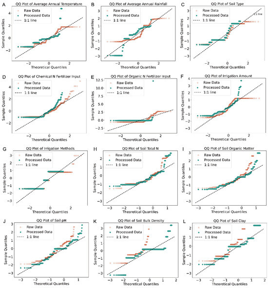 Figure 1. Raw data and processed data QQ plots of average annual temperature (A), average annual rainfall (B), soil type (C), chemical N fertilizer input (D), organic N fertilizer input (E), irrigation amount (F), irrigation methods (G), soil total N (H), soil organic matter (I), soil pH (J), soil bulk density (K) and soil clay (L).