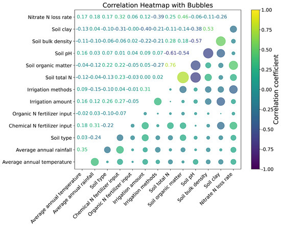The Pearson’s correlation coefficient was used to measure the linear correlation between continuous variables (Figure 2). This analysis allows for screening predictor variables based on their influence on and contribution to the target variable. High correlations between certain features may justify the removal of one to reduce redundancy. In the Pearson’s correlation analysis (Figure 2), the nitrate N loss rate showed positive correlations with chemical N fertilizer input, soil organic matter, and total N, and negative correlations were observed relative to soil pH, bulk density, clay content, and irrigation methods. The correlations between nitrate N loss and the other variables were weak. Positive correlations were also observed between average annual rainfall and temperature, as well as between irrigation method and irrigation amount; notably, the QQ plots for rainfall and irrigation amount align closely with a normal distribution. Based on the QQ plots and the correlation analysis, eight key features—average annual rainfall, chemical N fertilizer input, irrigation amount, soil total N, organic matter, pH, bulk density, and clay content—were selected for further analysis.