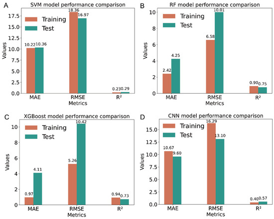 Figure 3. Comparison of R2, RMSE, and MAE using the SVM (A), RF (B), XGBoost (C), and CNN (D) models for nitrate–nitrogen loss rate prediction on training and test datasets. Abbreviations: SVM, support vector machine; RF, random forest; XGBoost, extreme gradient boosting; CNN, convolutional neural network. Moving average error (MAE), root mean square error (RMSE), and coefficient of determination (R2).