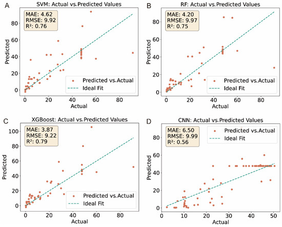 Figure 4 demonstrates the fitting statistics for each model after Bayesian optimization with 10-fold cross-validation, which was evaluated using the MAE, RMSE, and R2 metrics. The optimization improved the performance of all four models. Among them, XGBoost achieved the highest predictive accuracy (R2 = 0.79) and the lowest MAE (3.87) across the test sets, followed closely by the RF and SVM, with R2 values of 0.75 and 0.76, respectively. The CNN model displayed the lowest R2 (0.56) and highest MAE (6.50) and RMSE (9.99), indicating the weakest performance among the models. These results suggested that tree-based models such as XGBoost were particularly well suited to this regression task due to their capability to capture complex nonlinear relationships in the data.