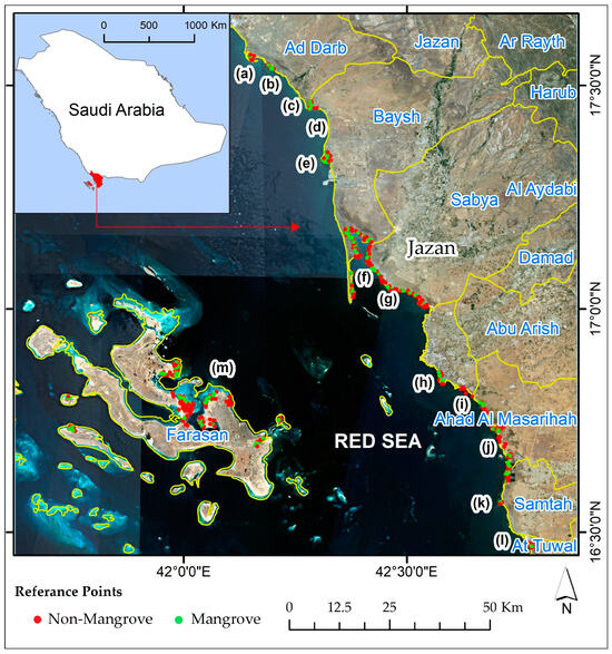 Geographical extent of the Jazan mangrove ecosystems (a–m) in Saudi Arabia. Blue lines indicate seasonal streams, highlighting the distinction between riparian and nonriparian (e,m) mangrove ecosystems. Green points represent reference samples for mangrove areas, while red points denote non-mangrove reference samples, illustrating their distribution across the study area.